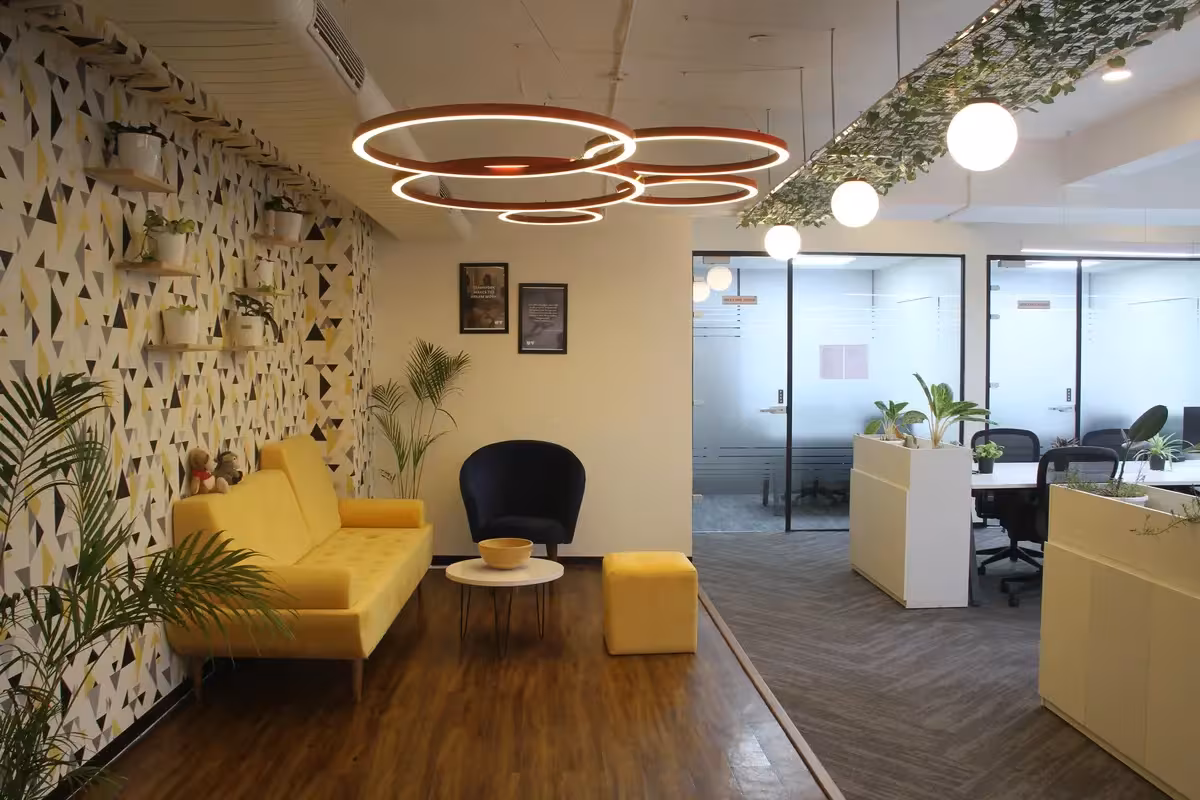 A modern office space lounge area in Bangalore with yellow couches and a central table, provided by Urban Vault.